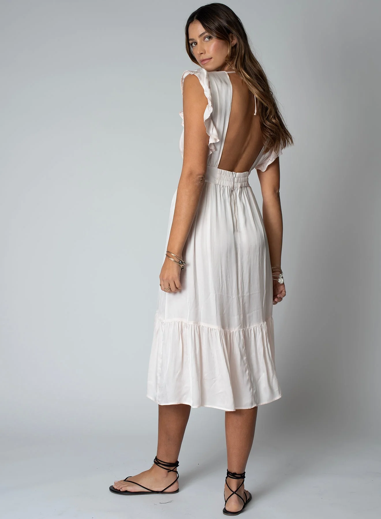 The Jessie Midi is our most iconic silhouette and easily one of the most loved dresses we've ever made. With a plunging neckline, side slit, and soft ruffle-trimmed shoulders, it’s feminine, flattering, and endlessly wearable. A concealed back zipper keeps the fit clean and streamlined.